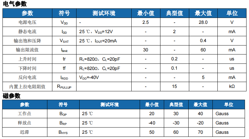 當磁場南極靠近HS261TO 標識面,磁場強度達到閾值時,功率管導通,輸出低電平。當磁場北極靠近HS261TO標識面,磁場強度達到閾值時,功率管截止,輸出高電平。