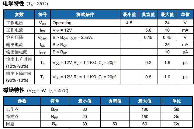 當(dāng)S極接近器件標(biāo)記面,且當(dāng)施加到霍爾效應(yīng)片的磁感應(yīng)強(qiáng)度B超過工作點(BOP)時(即B>BOP>0),輸出導(dǎo)通, 輸出變低。當(dāng)磁感應(yīng)強(qiáng)度減弱低于釋放點(BRP(即0 N極磁場接近器件標(biāo)記面不能觸發(fā)芯片工作,N極磁場可從標(biāo)記面的反面接近器件觸發(fā)器件導(dǎo)通。