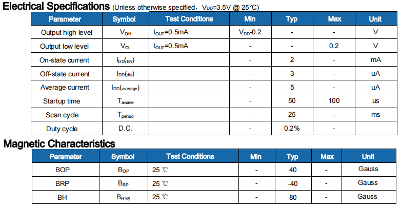 When the south pole of the magnetic field is close to the chip identification surface and the magnetic field strength reaches the threshold, the output is low level; when the north pole of the magnetic field is close to the chip identification surface and the magnetic field strength reaches the threshold, the output is high level.