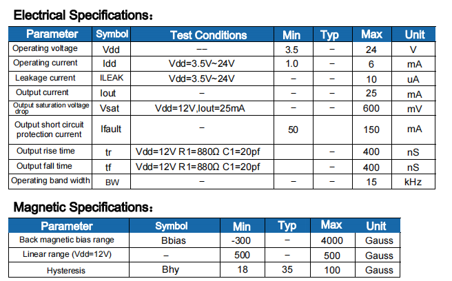 HS17A contains a 10-bit ADC and logic sampling and holding circuit on the chip. The independent 4-bit ADC ensures stable hysteresis. The circuit has no chopping delay and uses a single Hall version, which eliminates the alignment problem between the device and the gear. The magnetic field bias range can reach -500GS to 4000GS.