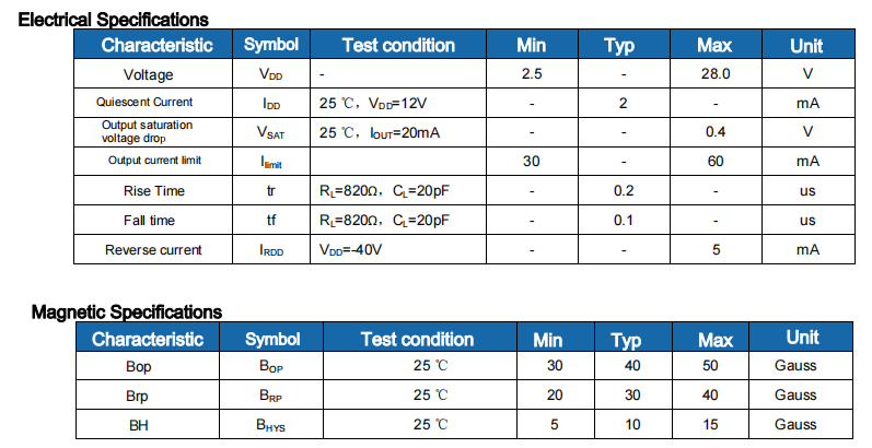 HS220 is a unipolar Hall effect switching IC manufactured using advanced BiCMOS processes, with excellent temperature stability and high mechanical stress resistance, achieving the highest operating performance of the product
