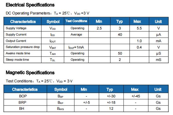 In terms of circuit design, HS271 provides an embedded controlled clock mechanism to provide a clock source for the Hall device and analog signal processing circuit. At the same time, this controlled clock mechanism can send a control signal to make the circuit with high current consumption periodically enter the "sleep" mode; through this mechanism, the chip is periodically "woken up" and detects the strength of the magnetic field passing through the Hall device according to the predetermined magnetic field strength threshold. If the magnetic flux density is higher than the "operating point" threshold or lower than the "release point" threshold, the open-drain output transistor is driven and latched into the corresponding state. During the "sleep" cycle, the output transistor is locked in the previous state. In battery-powered applications, this design provides the best support for extending the working life.