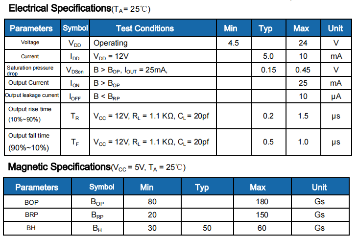 When the S pole is close to the device marking surface and when the magnetic induction intensity B applied to the Hall effect chip exceeds the operating point (BOP) (i.e. B>BOP>0), the output is turned on and the output becomes low. When the magnetic induction intensity decreases below the release point (BRP, i.e. 0), the N-pole magnetic field approaching the device marking surface cannot trigger the chip to work, while the N-pole magnetic field can approach the device from the opposite side of the marking surface to trigger the device to turn on.