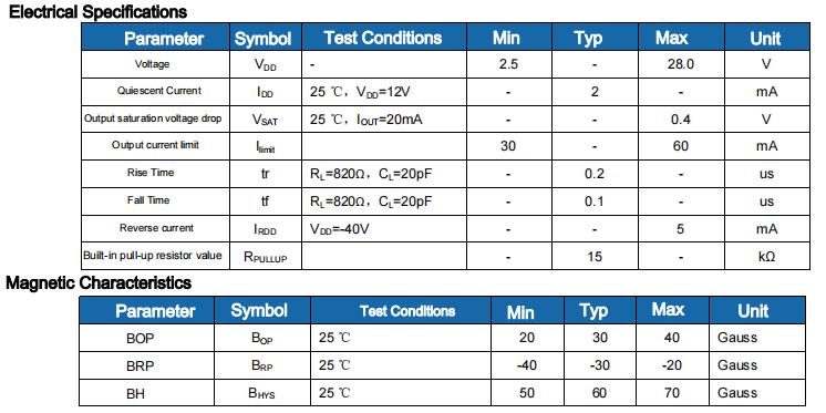 When the south pole of the magnetic field approaches the HS261TO logo surface and the magnetic field strength reaches the threshold, the power tube is turned on and the output is low. When the north pole of the magnetic field approaches the HS261TO logo surface and the magnetic field strength reaches the threshold, the power tube is turned off and the output is high.