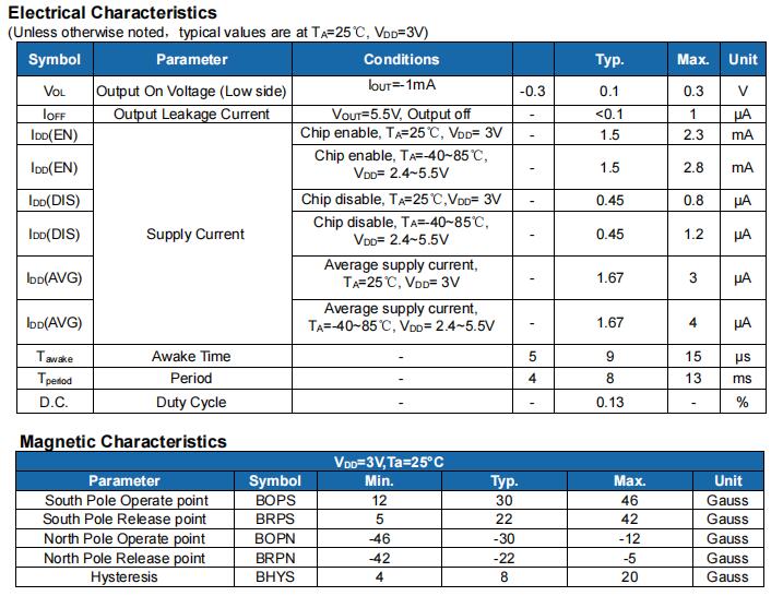 In terms of circuit design, HS475 provides an embedded controlled clock mechanism to provide a clock source for the Hall device and analog signal processing circuit. At the same time, this controlled clock mechanism can send a control signal to make the circuit with high current consumption enter the "sleep" mode periodically; through this mechanism, the chip is periodically "woken up" and detects the strength of the magnetic field passing through the Hall device according to the predetermined magnetic field strength threshold. If the magnetic flux density is higher than the "operating point" threshold or lower than the "release point" threshold, the open-drain output transistor is driven and latched into the corresponding state. In the "sleep" cycle, the output transistor is locked in the previous state. In battery-powered applications, this design provides the best support for extending the working life.