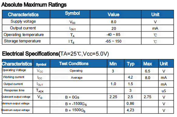 When the S pole appears on the HS49E marking face, the output voltage will increase linearly with increasing magnetic field strength; conversely, the N pole will cause the output voltage to decrease linearly with increasing magnetic field strength.