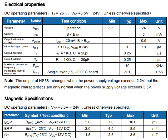 Recommended model: HS581 unipolar high-sensitivity Hall element