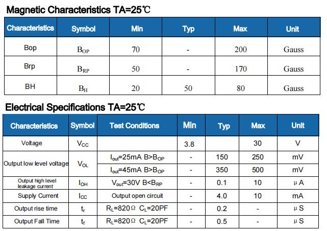 The HS43F unipolar switch type Hall position sensor is a magnetic sensing circuit composed of an internal voltage regulator, a Hall voltage generator, a differential amplifier, a temperature compensation unit, a Schmitt trigger and a collector open circuit output stage. Its input is the magnetic induction intensity and the output is a digital voltage signal. It is a magnetic sensing circuit working with a single magnetic pole, suitable for working under rectangular or cylindrical magnets. The operating temperature range is -40 ℃ ~ 150 ℃, the power supply voltage operating range is 3.8V ~ 30V, the load current capability can reach up to 50mA, and the package form is SIP3L (TO92S).